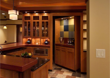 Blend a pantry entrance into your kitchen cabinetry with a Hidden Door that looks like part of the built-in shelving